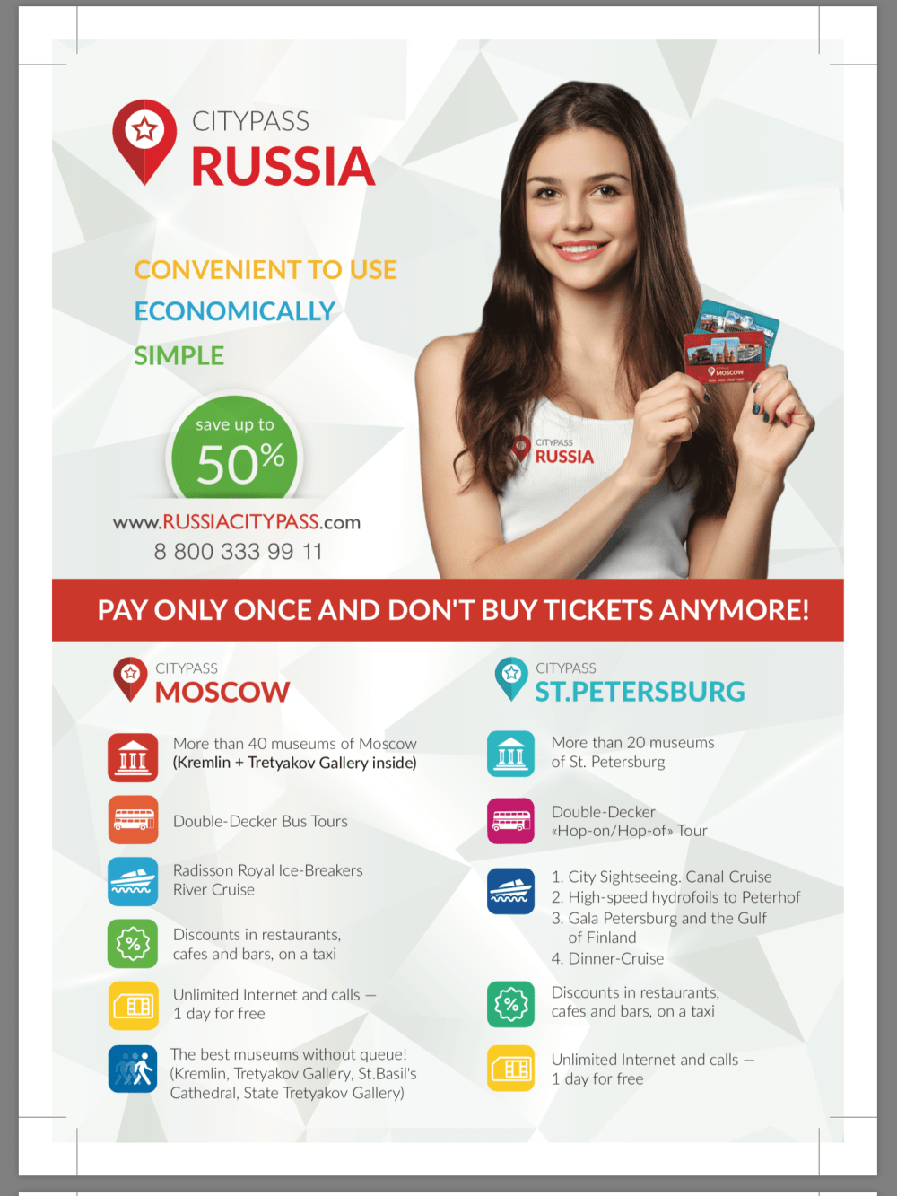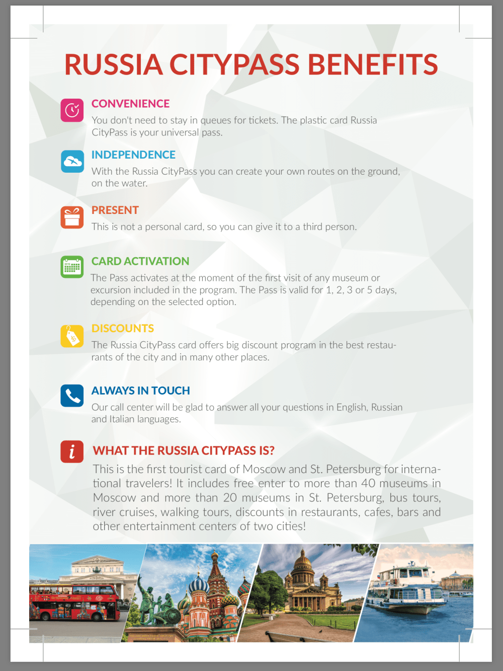 Russia City Pass (https://russiacitypass.com/en) ใส่ promocode เขียนว่า pagetiewrussia กันนะครับถ้าจะซื้อ จะได้ส่วนลดเพิ่มอีก 5% ซึ่งจะทำให้เพื่อนๆ ได้รับความสะดวกสบายในการท่องเที่ยวในเมืองมอสโก และเซนต์ปีเตอร์สเบิร์ก โดยบัตรนี้ซื้อครั้งเดียว สามารถเข้าพิพิธภัณฑ์ฟรีได้กว่า 40 แห่งในเมืองมอสโก