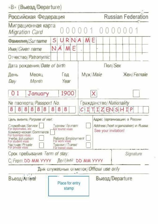 การไปไหนมาไหนในประเทศรัสเซียตามกฎหมายจะต้องพกพาสปอร์ตและเอกสารเข้าเมืองเสมอ และหากใครอยู่นานเกินกว่า 7 วันทำการ (รวมเสาร์-อาทิตย์ จะเป็น 9 วัน) จะต้องมีเอกสารอีกตัวจากที่พักนั่นคือใบลงทะเบียนถิ่นที่อยู่ หรือ Registration card หรือ Registration to Foreign Migration Service of Russia เพิ่มเติม